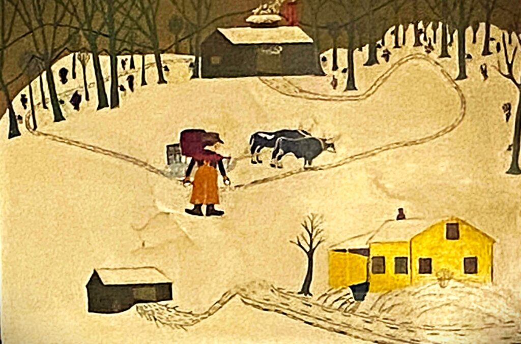 The second item, from our Art Collection, is a folk-art style painting, titled “Sugaring” by Clarence J. Swinyer (1893-1978). Mr. Swinyer lived on the New Hague Road, Hague where his house and property were well populated with various pieces of his art. For many years he worked at the International Paper Co. mill in Ticonderoga. About a year ago a New York City gallery featured a selection of his sculptures and paintings. It was marketed as “a spirited selection of his sculptures and paintings, works that depict the landscapes flora and fauna of his rural mountains surroundings.”
