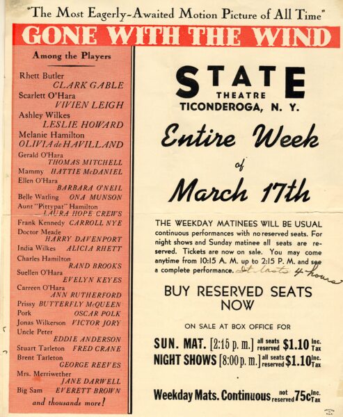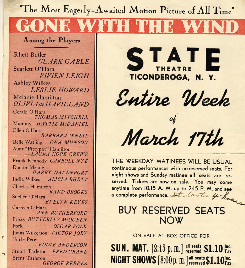 On March 17, 1940, Ticonderoga witnessed a moment of great excitement at the State Theater. The much-anticipated film, “Gone with the Wind”, billed as “The Most Eagerly-Awaited Motion Picture of All Time” made its debut for a full week of viewing pleasure. Moviegoers had the chance to see stars such as Clark Gable, Leslie Howard, Olivia de Havilland, and Vivien Leigh, who was quickly becoming a rising star.